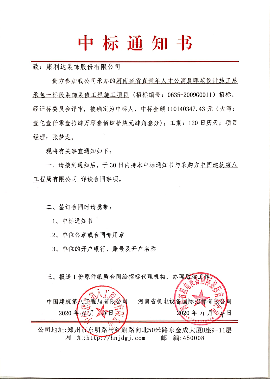 项目名称:河南省省直青年人才公寓晨晖苑设计施工总承包一标段装饰装修工程施工项目;中标金额:11014.03万元;